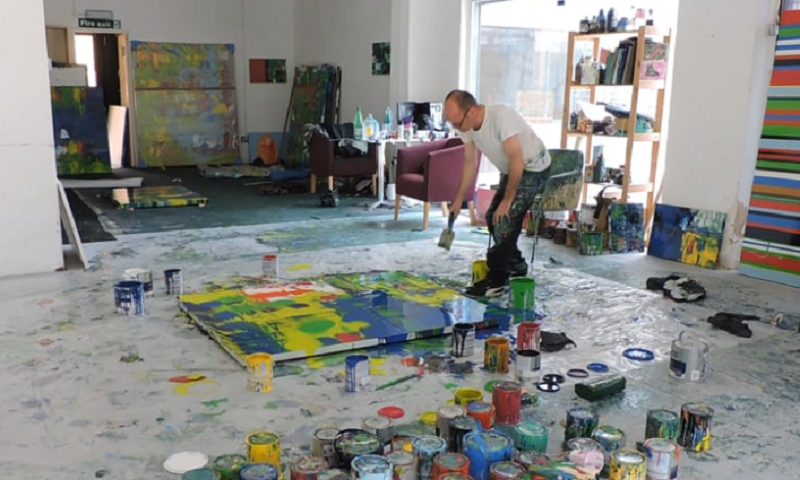 They often involve eight to 10 hours of continuous sessions re-working the paint on aluminium and MDF – dragging colour across the surface, pouring it on and taking it off to create the final flourish.