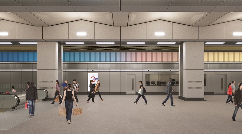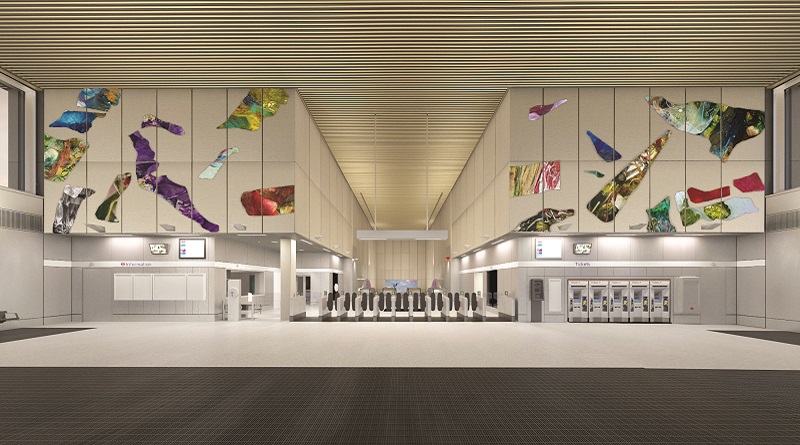 Pictured are Nine Elms station ticket hall artwork by Samara Scott, while Alexandre da Cunha’s artwork will adorn Battersea Power Station station.