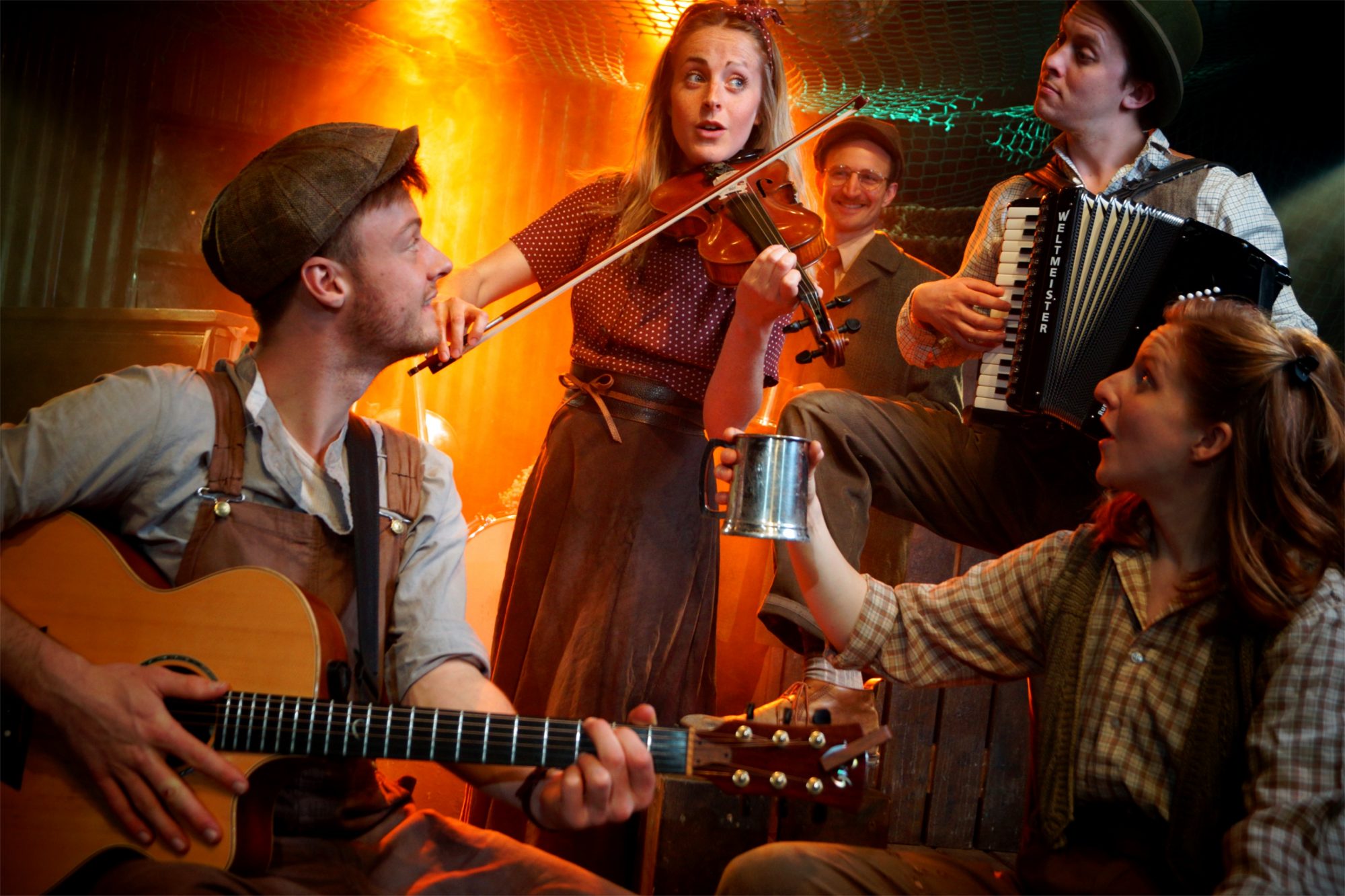 The multi-instrumentalist cast of five, playing on a coastal set of planks, rope and smoke, bring Benjamin’s story to life as a piece of theatrical storytelling, swapping roles as ages change, directly addressing the audience, and animating the story with a string of memorable songs.
