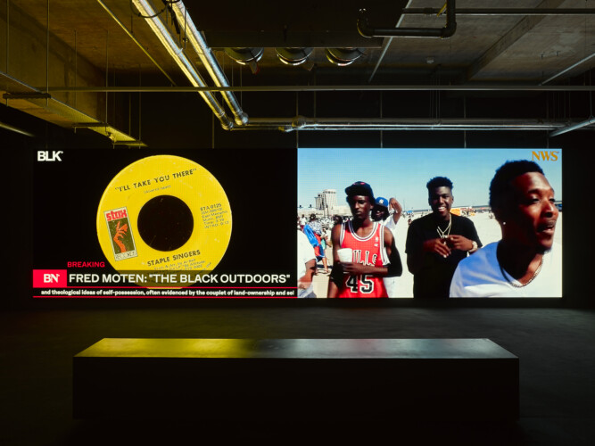 Elsewhere, in a video by Kahlil Joseph, a news channel reeling out headlines on American racism cuts to Aretha Franklin singing Amazing Grace.