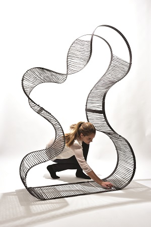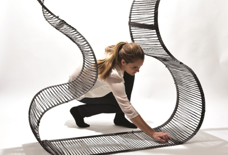Combining the ancient material Sabra thread made from cactus with industrial materials such as steel and aluminium, she weaves the natural into the constructed.
