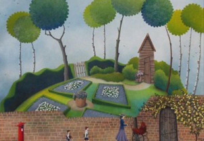 She also takes inspiration from Herefordshire and the River Wye, where she now lives with her family. As she painted, her traditional landscapes evolved into more imaginary rounded horizons with scenes of orchards, gardens and sea.
