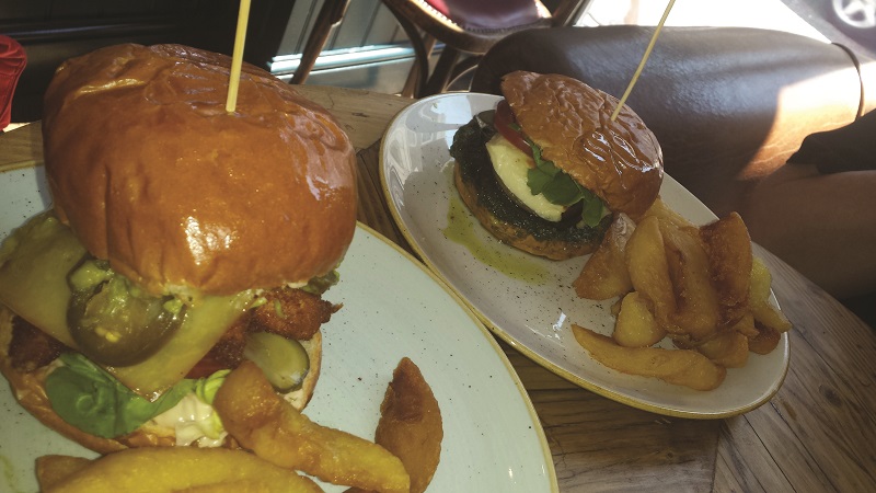 Both appealed but my veggie companion was super happy at the mere thought of halloumi, courgette, aubergine burger with pesto (£10), “most unusual for a veggie option”, as she put it.