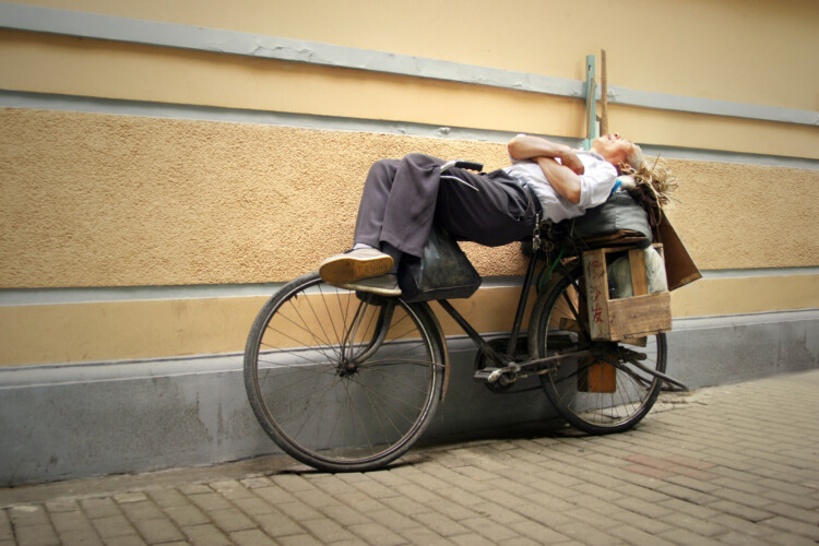 In China, street traders, workers, employees, or waiters are often seen falling asleep for a few minutes at their place of work, in the middle of the day, in the middle of the street.