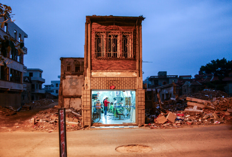 In another photograph, Resisting, a barber shop stands in the middle of a demolished ground.