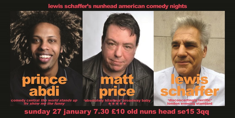 The next Nunhead American Comedy Night at the Old Nun’s Head, SE15 3QQ is on Sunday, January 27 at 7.30pm. The comics are Prince Abdi, Matt Price and Lewis Schaffer.