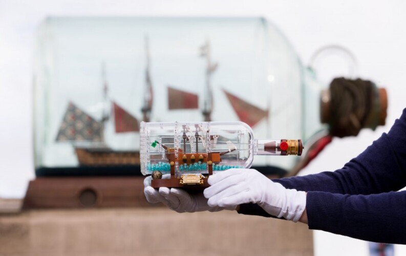 A new Lego ship in a bottle, available to buy in Lego stores and online, is now on display at the National Maritime Museum in Greenwich.