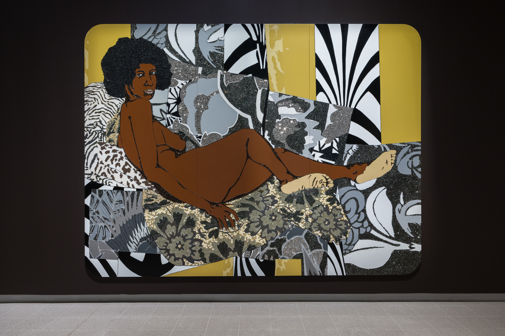 Mickalene Thomas: All About Love, features images of Black women luxuriating in domestic settings.