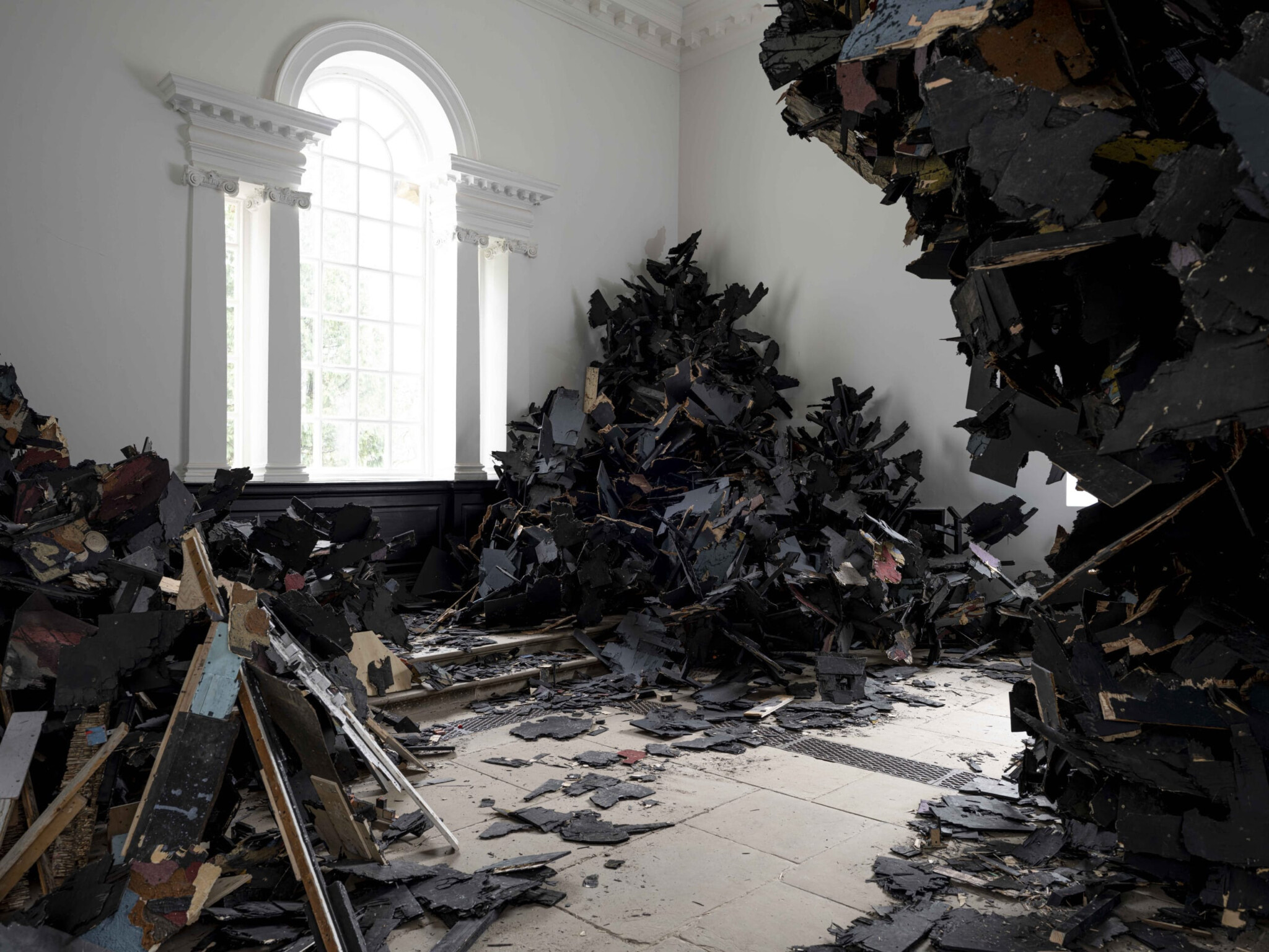 At the SLG, Mr Drew will present a new sculpture which will cover the walls and floor of the exhibition space with fragments of wood recalling the formation of extreme weather events, natural disasters or, in the artist’s words, “acts of God”.