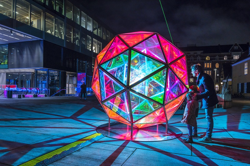 Located on the Riverside Terrace, Dichroic Sphere is a light sculpture by Danish artist and designer Jakob Kvist.