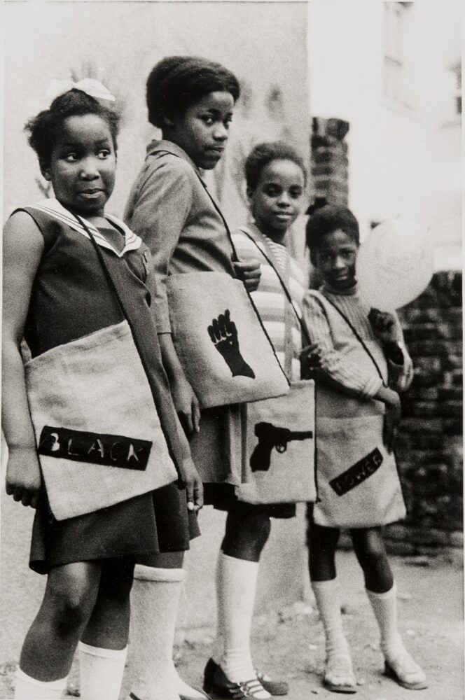 The rise of Black Power in Britain is shown in works such as Horace Ové’s photographs of Stokely Carmichael and Neil Kenlock’s Black Panther school bags 1970.