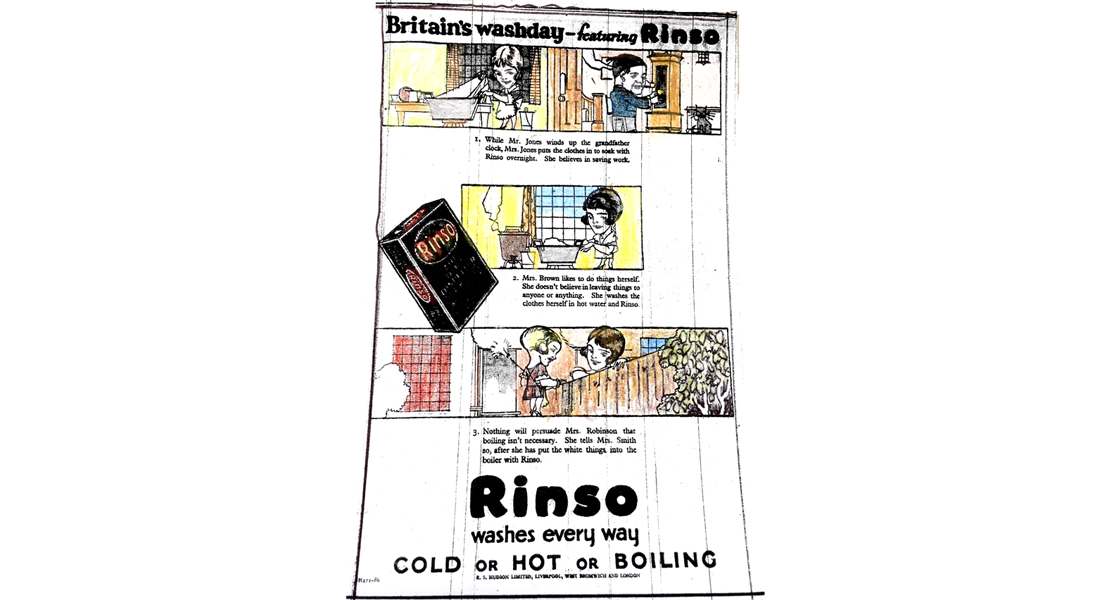 “While Mr Jones winds up the grandfather clock, Mrs Jones puts the clothes into soak with ‘Rinso’ overnight. She believes in saving work. (Don’t we all).