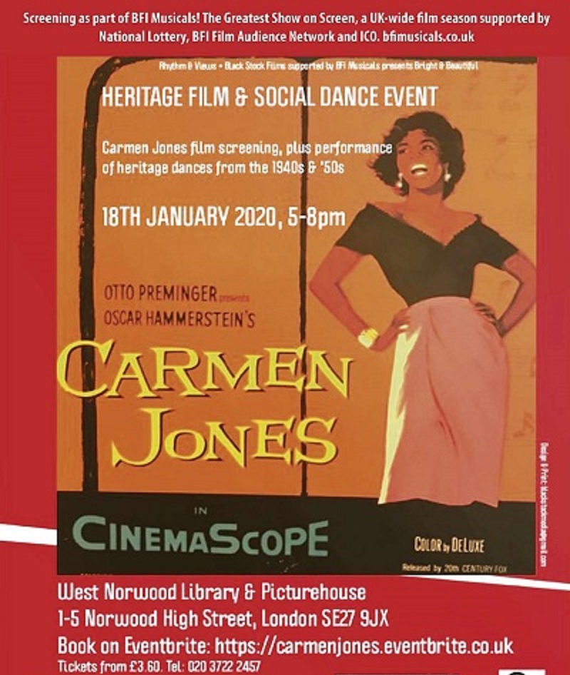 Rhythm & Views + Black Stock Films presents a dazzling Black heritage film, Carmen Jones AND vintage dance performance of 1940s / ’50s dances at West Norwood Library & Picturehouse on 18th January 2020.