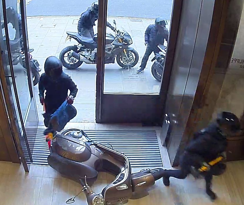 One of the men drove a moped through the front doors of the shop before three of the men – each armed with a sledgehammer – rushed in.