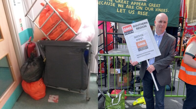 Mick Lynch joins striking hospital cleaners as bins overflow on wing