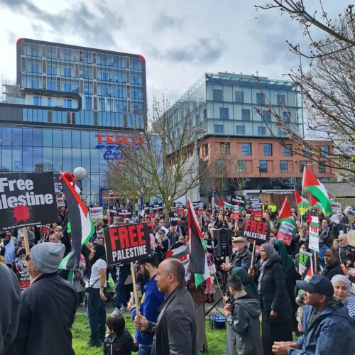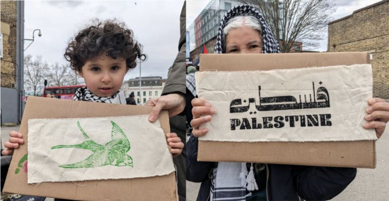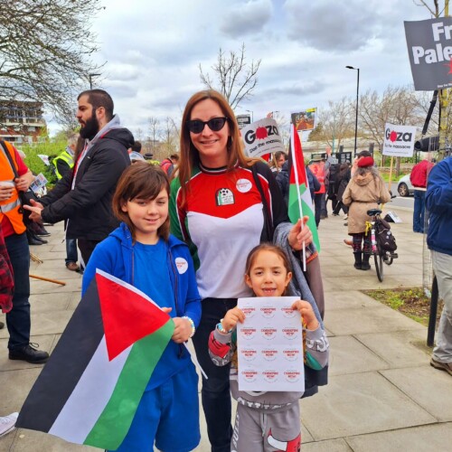 Among the crowds waving Palestinian flags and banners were children and their families, as well as representatives from activist groups including the Campaign for Nuclear Disarmament (CND) and Lewisham Stop the War Coalition.