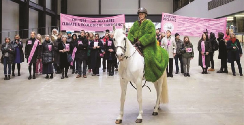 A slow silent march into the Tate Modern turbine hall, led by a woman on a white horse, was the culmination of a protest by more than 180 leading UK arts and culture projects declaring a climate emergency.