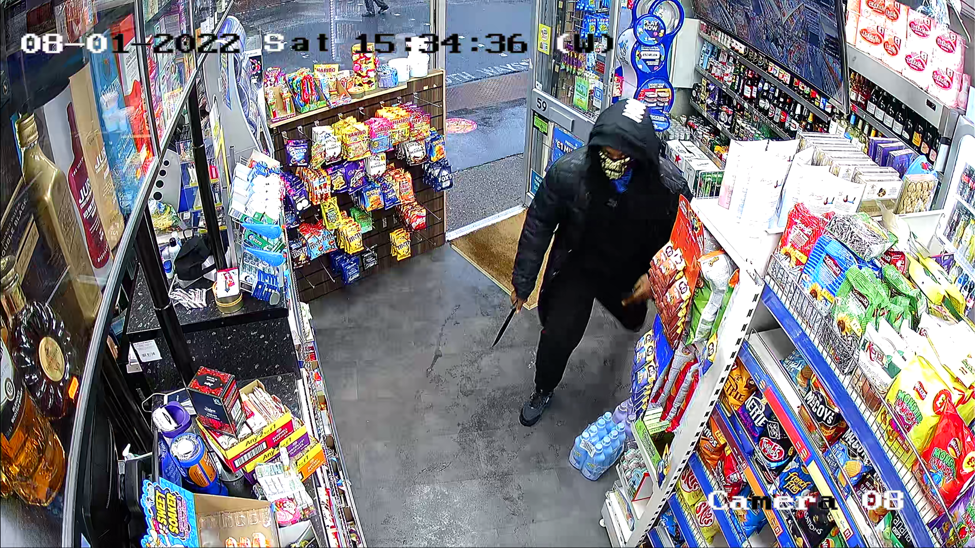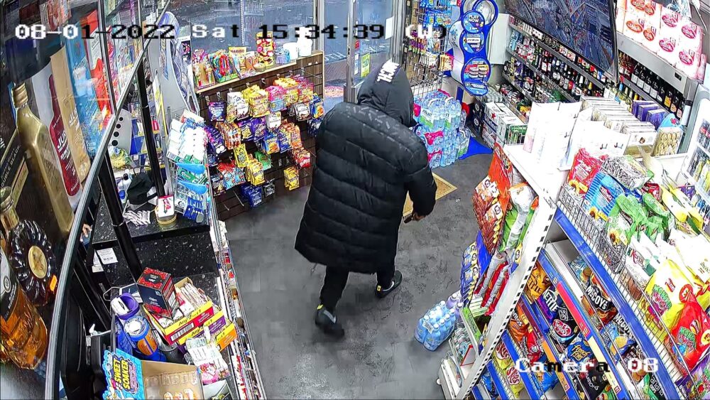 The image released by the police shows a man wearing a long black puffer coat with white writing on the hood, dark trousers and dark trainers.