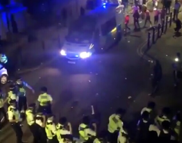 A voice on the Twitter video can be heard saying “they are driving the police out of Angell Town,” as officers appear to retreat from the huge crowd.