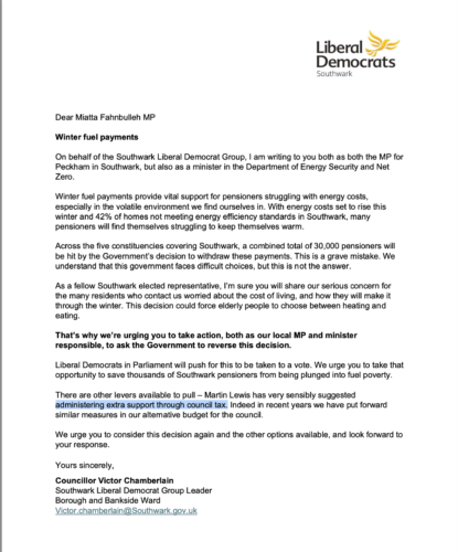 In their letter, Southwark Liberal Democrats pointed to other measures available including administering extra support through council tax.