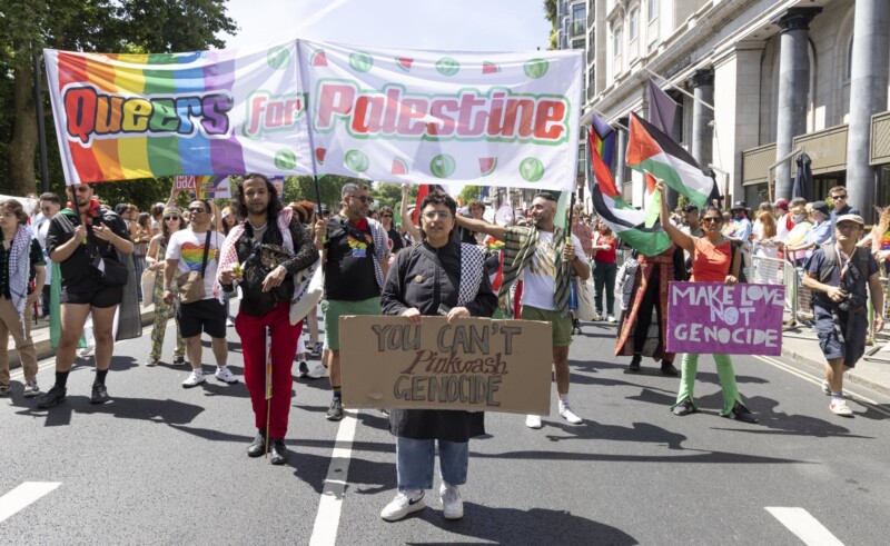 The group held posters accusing Israel of genocide and condemning “pinkwashing” – the accusation that the Israeli Government takes a progressive position on gay rights to improve its international reputation.