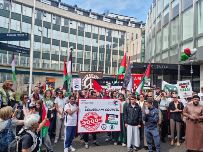Peace activists rallied outside Lewisham town hall on May 8, as the decision to remove Cllr Liam Shrivastava from the council’s Pension Investment Committee (PIC) was finalised at the council’s Annual General Meeting (AGM).
