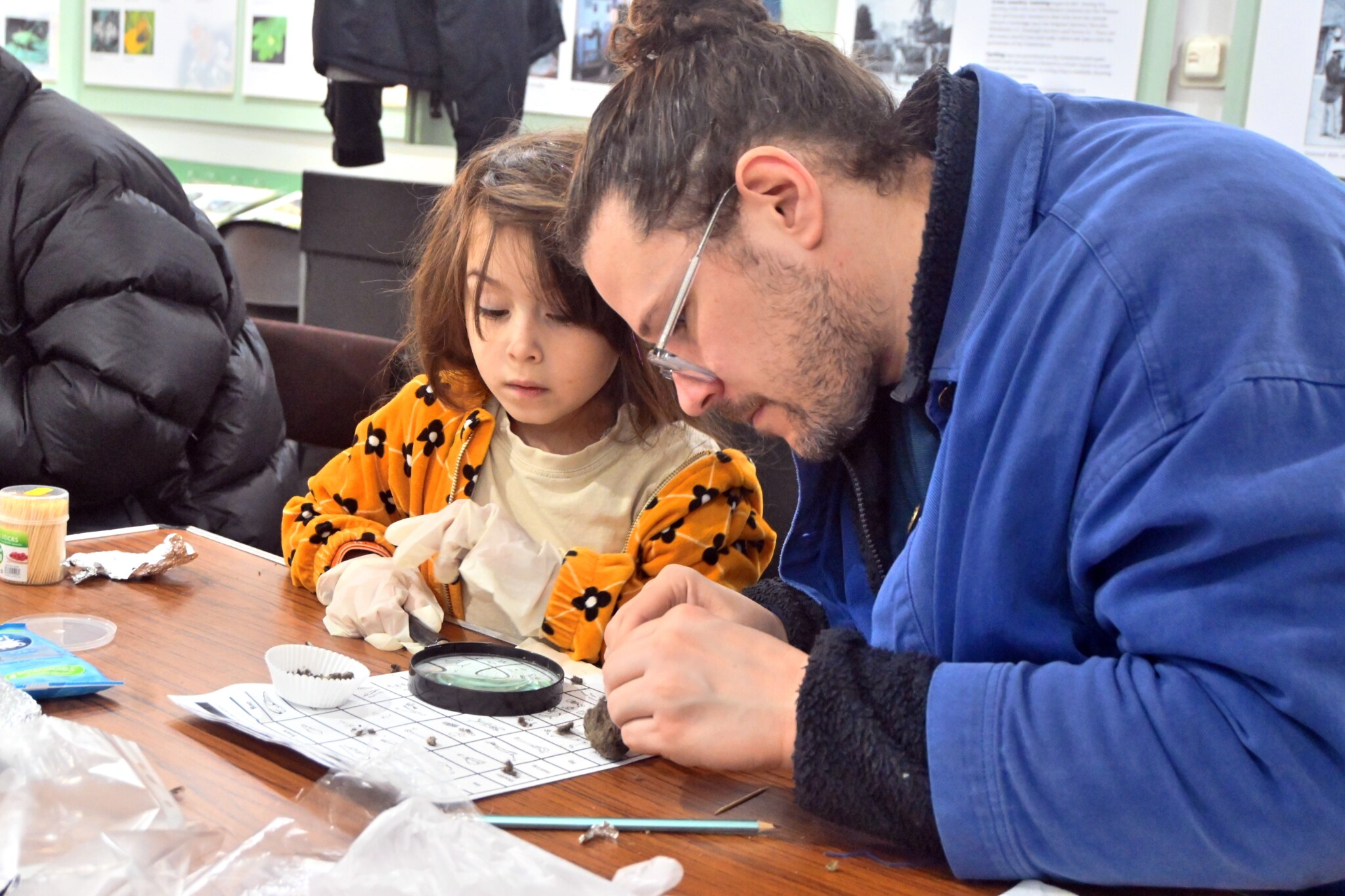 Pictured top: Jet Southwood-Jeffries, five, with her father Jack Jeffries, examining an owl pellet (Picture: Auriel Glanville)