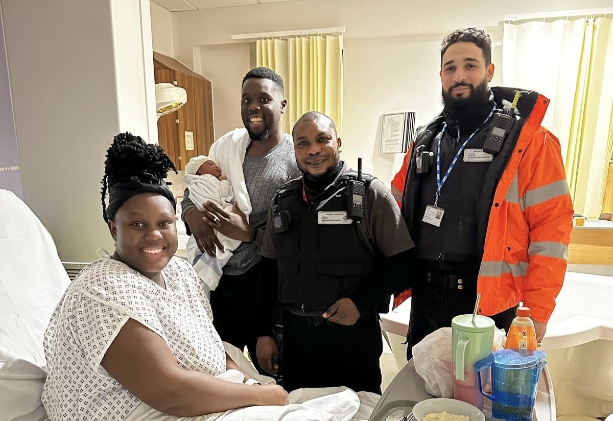 Pictured top: Odia and her partner Obji holding their new baby girl, Ocean, alongside security colleagues at University Hospital Lewisham (Picture: Lewisham and Greenwich NHS Trust)