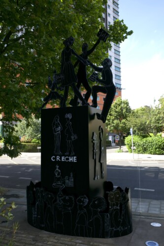 The sculpture depicts characters representing each of the disciplines offered at Morley College: music, dance, choir, sculpture, academic disciplines and career opportunities.