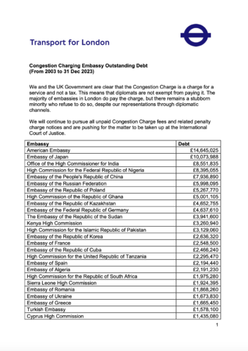 The transport network noted that the “majority” of embassies in London pay the charge but a “stubborn minority” refuse to do so.
