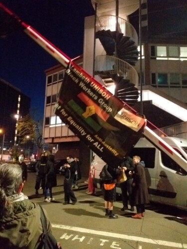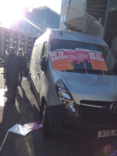 Activists from Croydon Stand up to Racism, Lambeth Unison black workers group, BLM Croydon and Care 4 Calais met at Lunar House immigration reporting centre at 4.30pm.