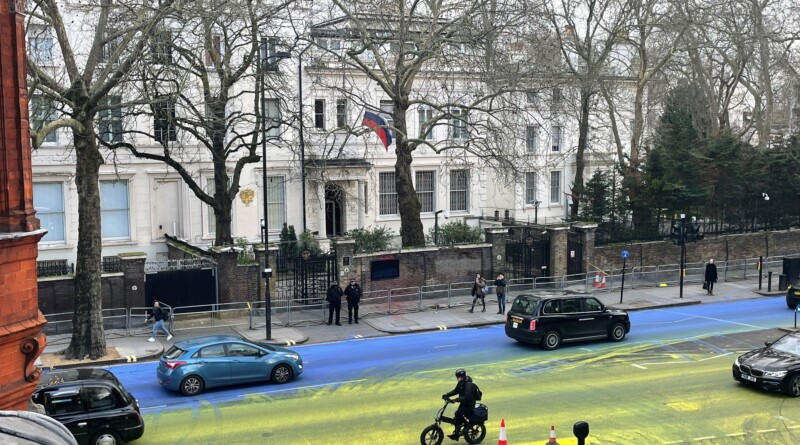 Arrests made as Ukraine flag painted outside Russian embassy in Kensington