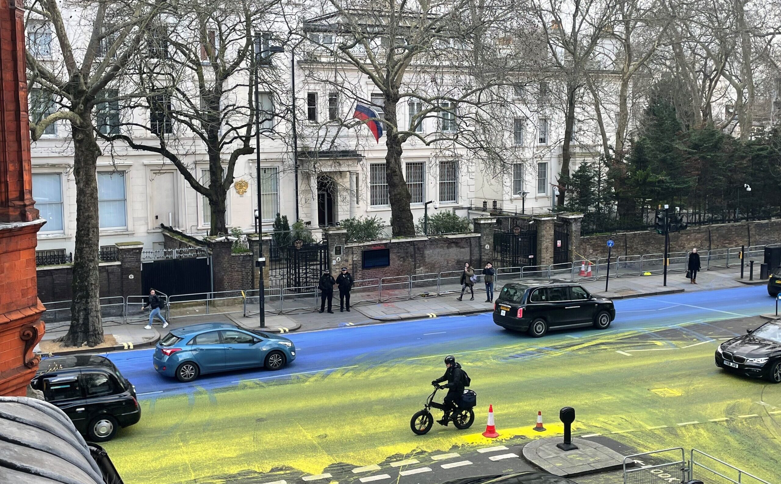 Arrests made as Ukraine flag painted outside Russian embassy in Kensington