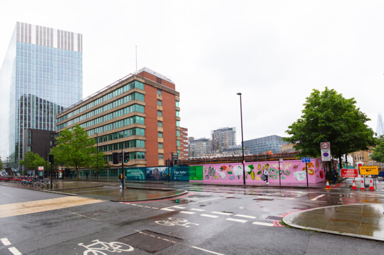 Jenny Adams, who is a resident of Hopton’s Almshouse in Hopton Street, Southwark, was set the task to make a site-specific artwork for the hoardings in Blackfriars Road and Nicholson Street, as part of Tenderground and Southwark Charities art programme.