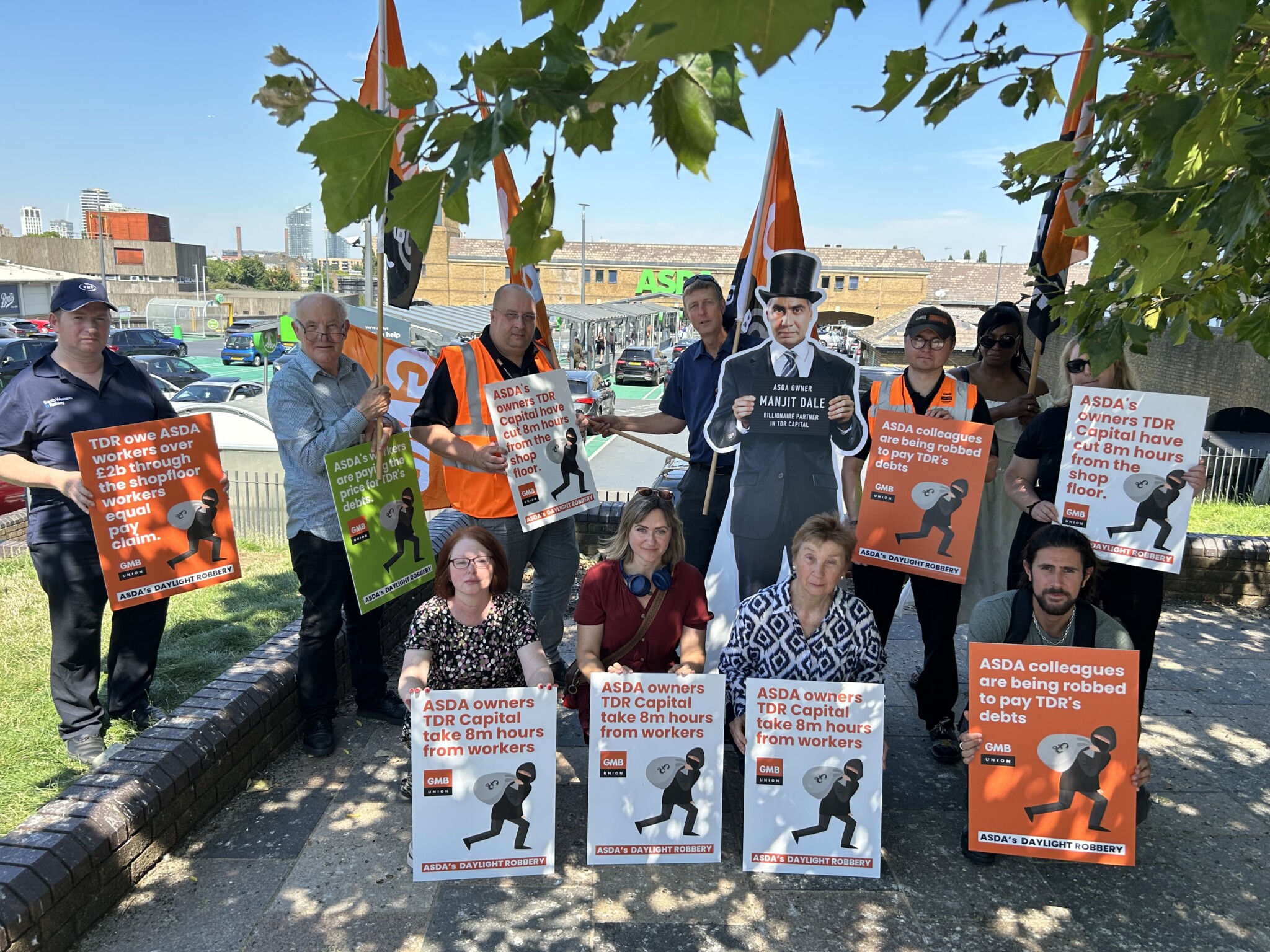 Pictured top: ASDA workers and GMB members outside the Clapham store today (Picture: GMB)