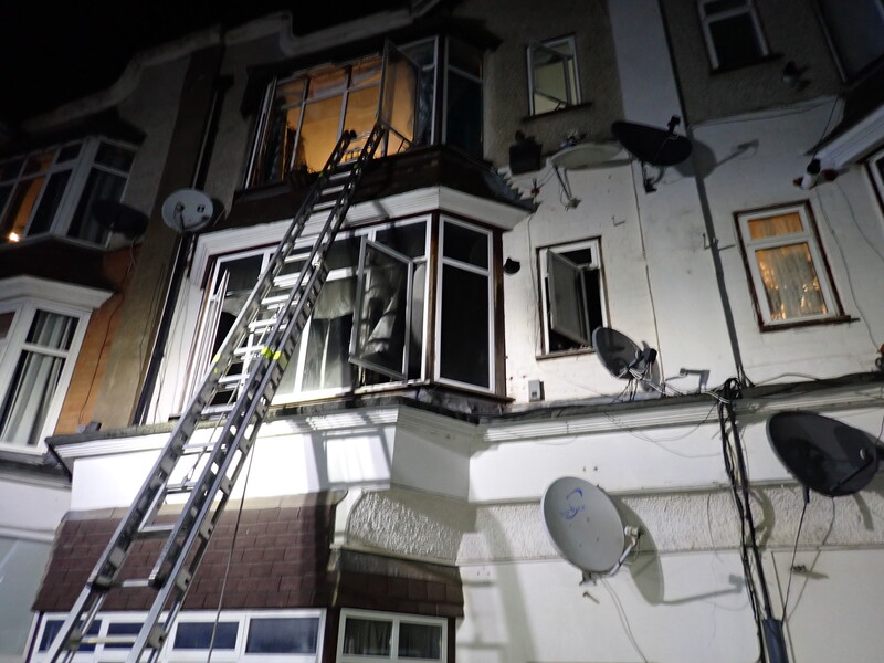 Firefighters wearing breathing apparatus quickly extinguished the fire. But the communal staircase was filled with smoke so fire crews used a nine metre ladder at the front of the property to rescue three people.