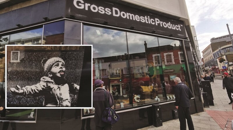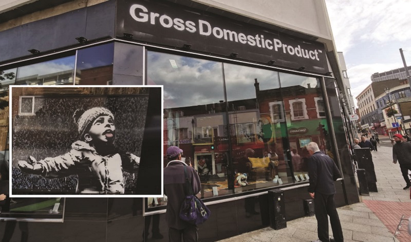 Above the shop are the words Gross Domestic Product, and small information signs in the piece direct viewers to the website grossdomesticproduct.com which just says Gross Domestic Product – the homewares store from Banksy – opening soon.