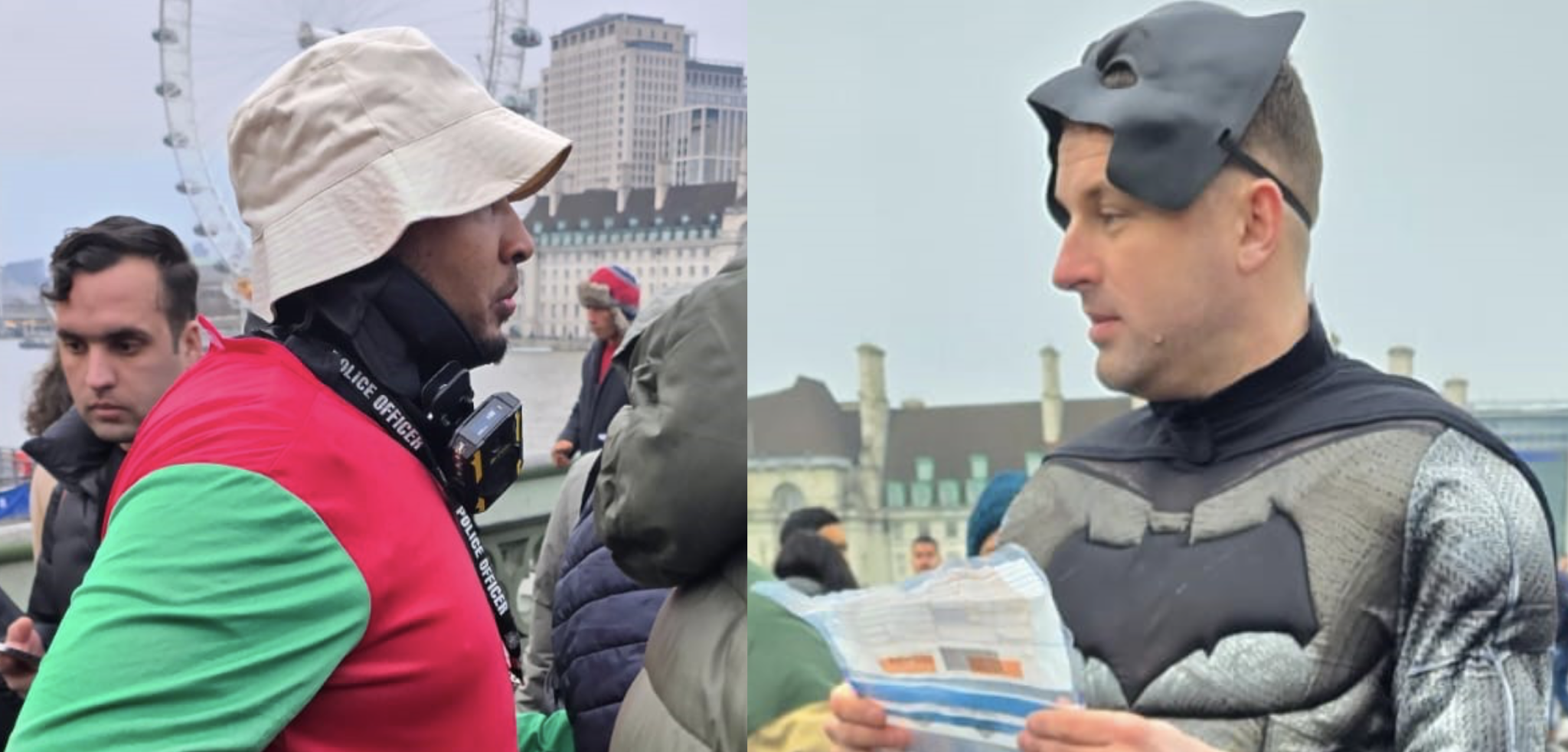 Video shows coppers dressed as batman and robin during an arrest on Westminster bridge (Picture: The Met)