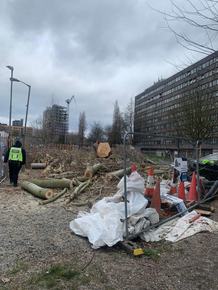 A spokesperson for the Winstanley and York Regeneration said this morning: “The safety of the protesters, local residents, our staff and operatives is our absolute priority. The felling of the tree has been carried out with the cooperation of the police, who we are in regular contact with. We reviewed the situation with the security contractor on site, alongside the police.”