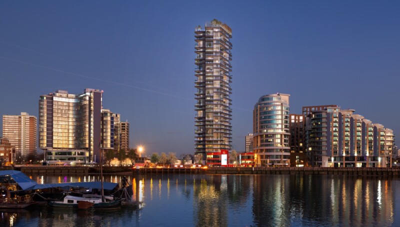 The developer said the scheme would see the replacement of unattractive buildings that ‘blight the local environment’ with a high-quality development in an ‘iconic design’. It pledged to make other improvements to the area, including making the section of the Thames Path behind London Heliport more accessible.