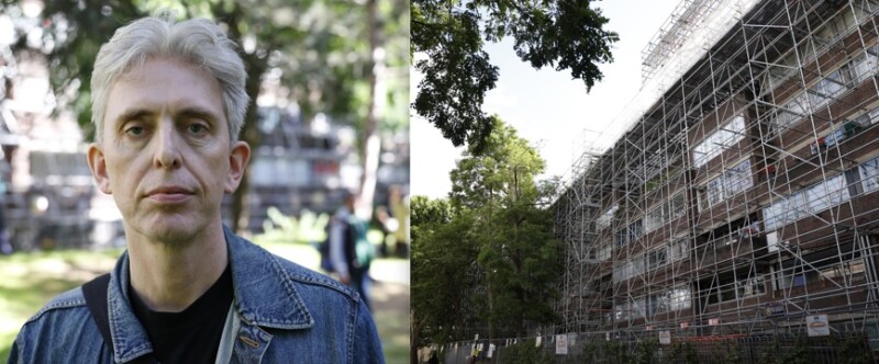 David O’Connell (left) who is among the residents unhappy with rising service charges and the impact on house values; And (right) The Lancaster West block under scaffolding (Pictures: Facundo Arrizabalaga)