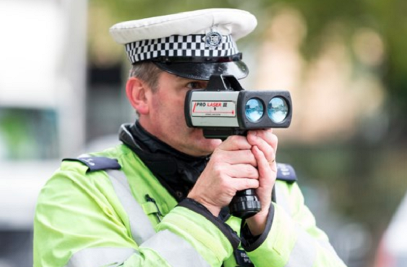 Pictured top: A police officer measures the speed of traffic with a speed gun
