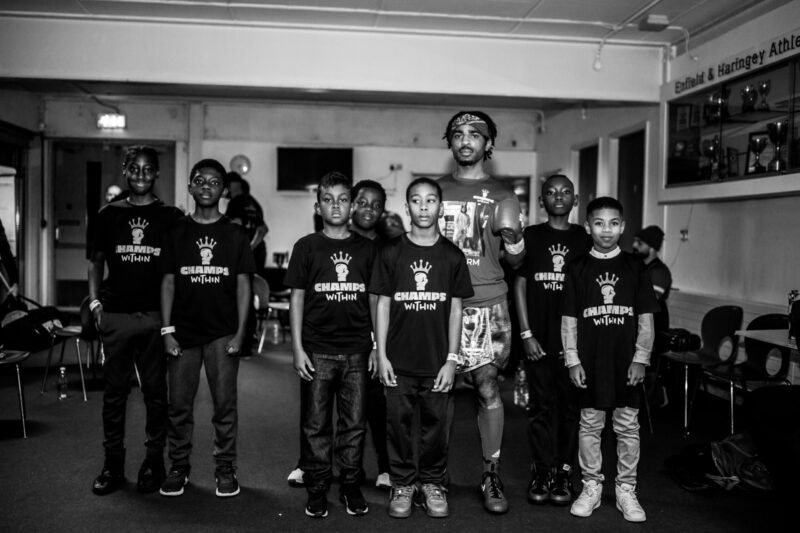 Pictured top: Champs Within kids support Sammy McKay before his boxing match (Picture: Champs Within and Miguel’s boxing gym)