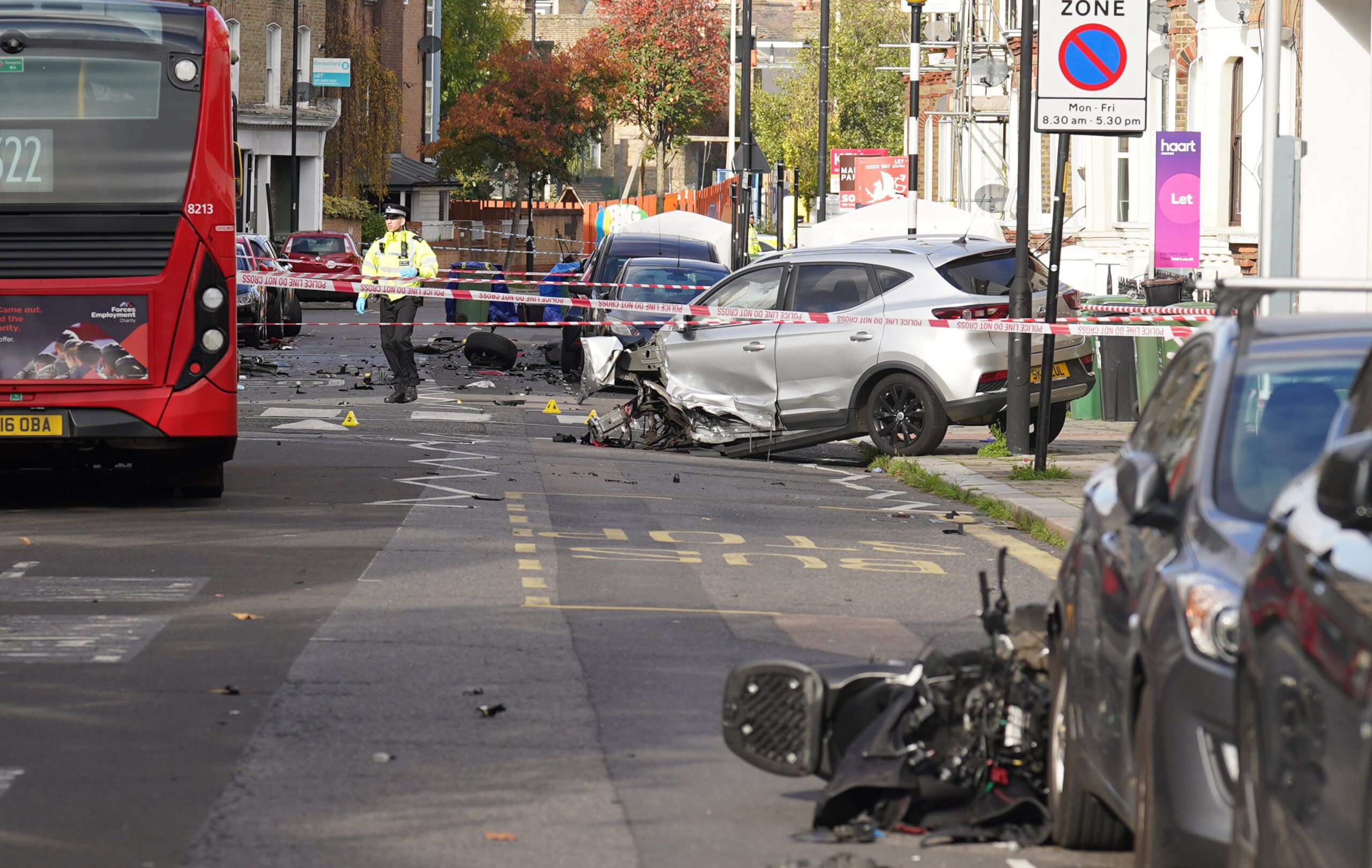 Pictured top: Scene of the crash and shooting in Railton Road, Brixton (Picture: PA)
