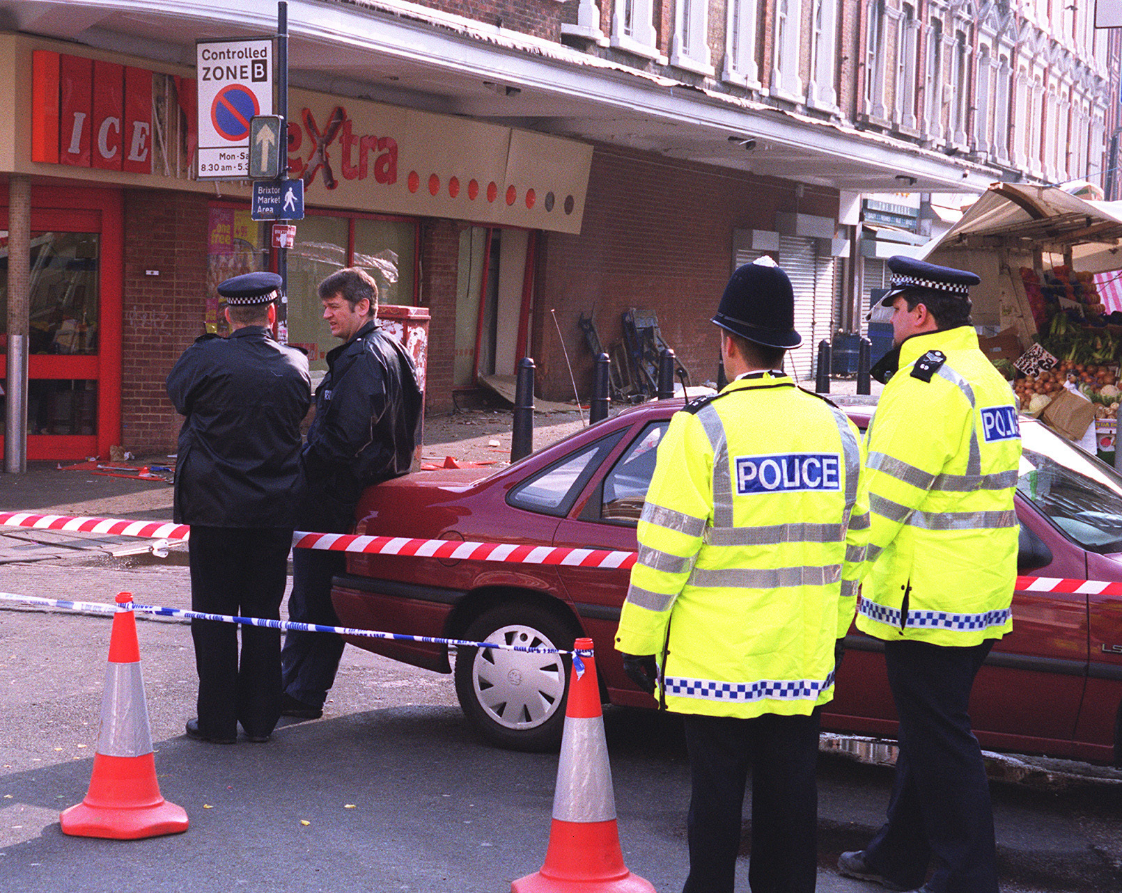 The bomb was made using explosives from fireworks, taped inside a sports bag, primed and left at Brixton Market. Traders became suspicious, and one of them, Gary Shilling, moved the bag to a less crowded area after seeing perpetrator Copeland acting suspiciously. Two further moves of the bomb occurred by unconvinced traders, including the bomb being removed from the bag, and ending up by the Iceland supermarket. Concerned traders called the police, who arrived at the scene just as the bomb detonated at 5.25 pm. The explosion blew out windows and blasting a car across the street – and 48 people were injured, many of them seriously because of the four-inch nails that were packed around the bomb.