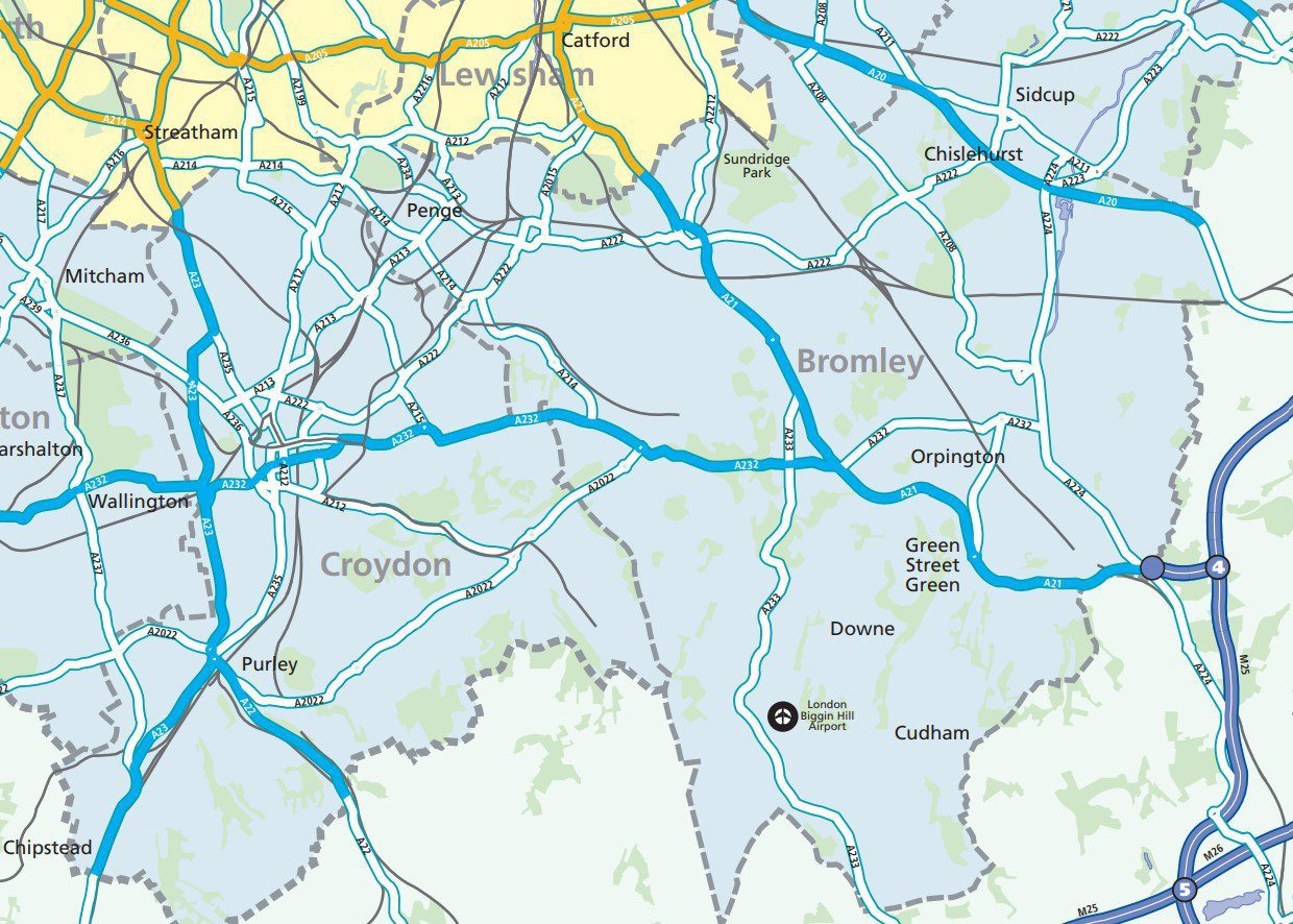 The three roads owned by TfL in Bromley include the A20 running from Lewisham through Chislehurst, the A21 from Catford through Orpington, and the A232 through Croydon.
