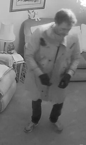 The victim saw a man, thought to be aged in his mid to late 30s or early 40s, standing outside her bedroom window. The window was then forced open before footage captures a man climbing inside and approaching the victim’s dresser and rummaging around for valuables.