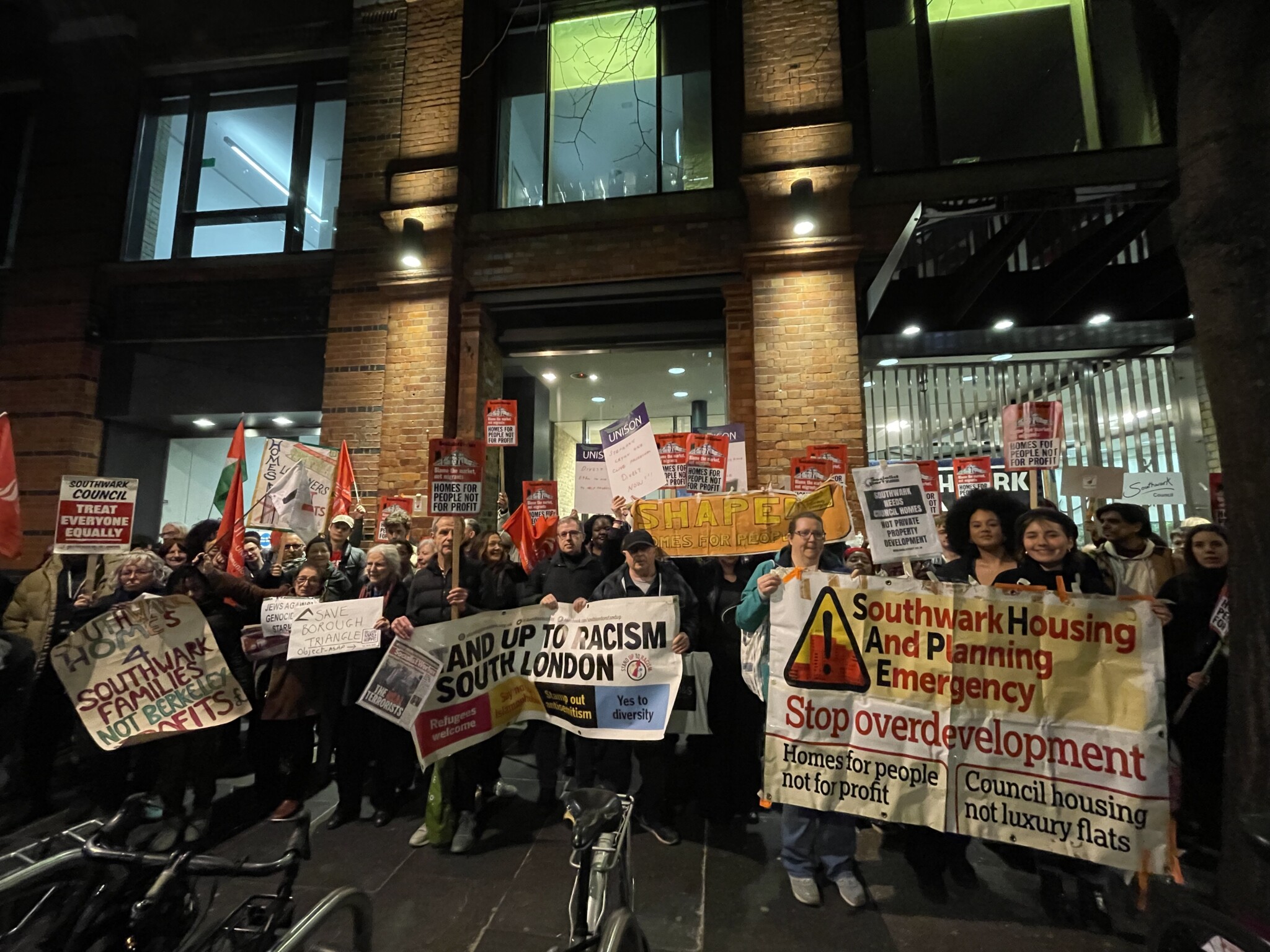 Southwark Housing And Planning Emergency (SHAPE), an umbrella group of housing campaigns from across Southwark, held a protest against the plans outside the town hall on the night of planning committee meeting.