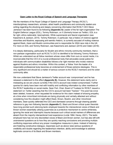 In an open letter to the RCSLT, the group said: “Whilst we understand we all follow members whose views differ from ours on social media, it is inconceivable that the chief executive of a crucial professional body that advocates social justice follows a far right member who incites violence against Muslims and ethnic minorities.