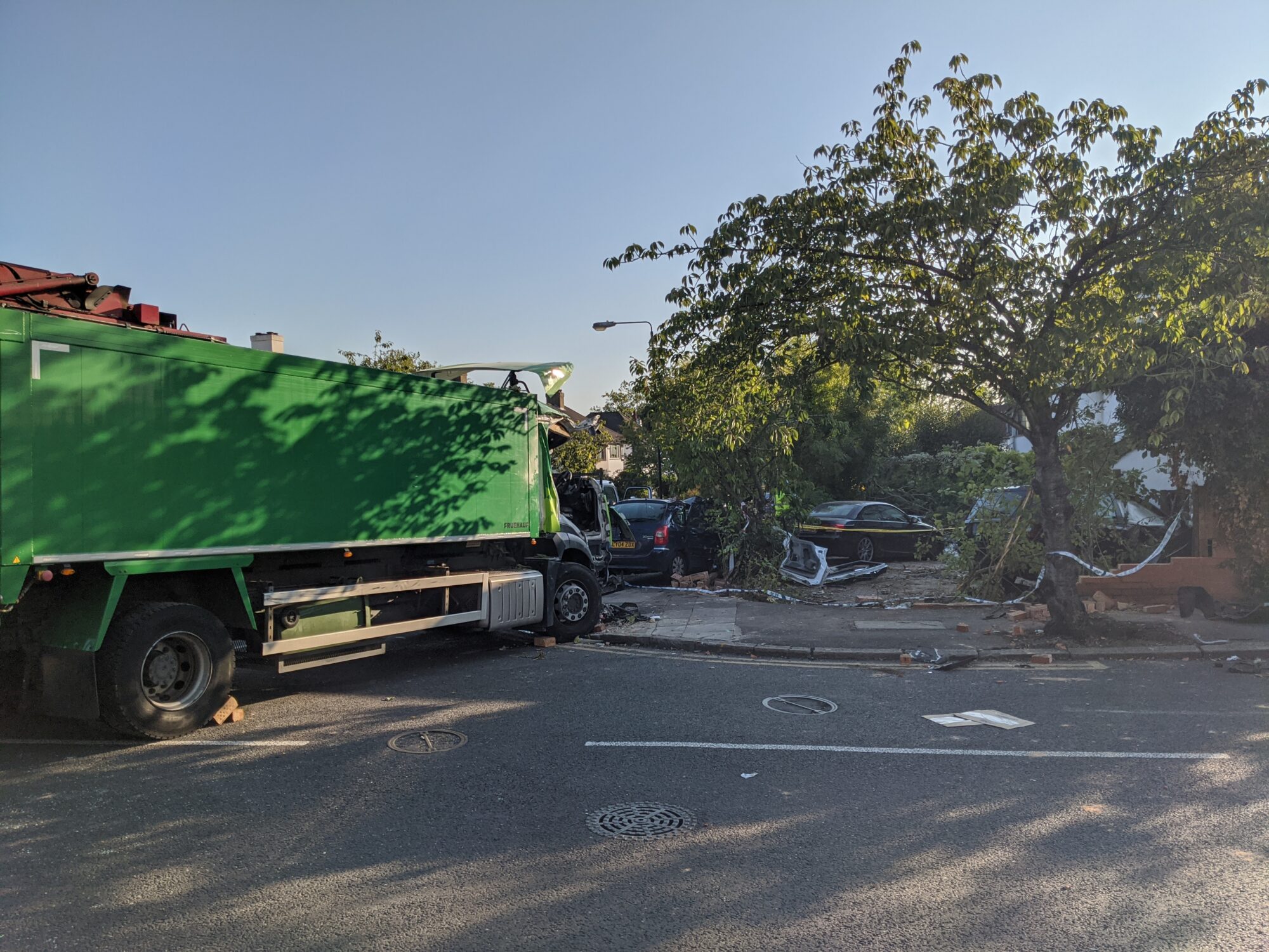 London Fire Brigade Station Commander Nathan Hobson, who was at the scene, said: “It was a challenging incident and it appears that a lorry collided with two cars and crashed into a house.